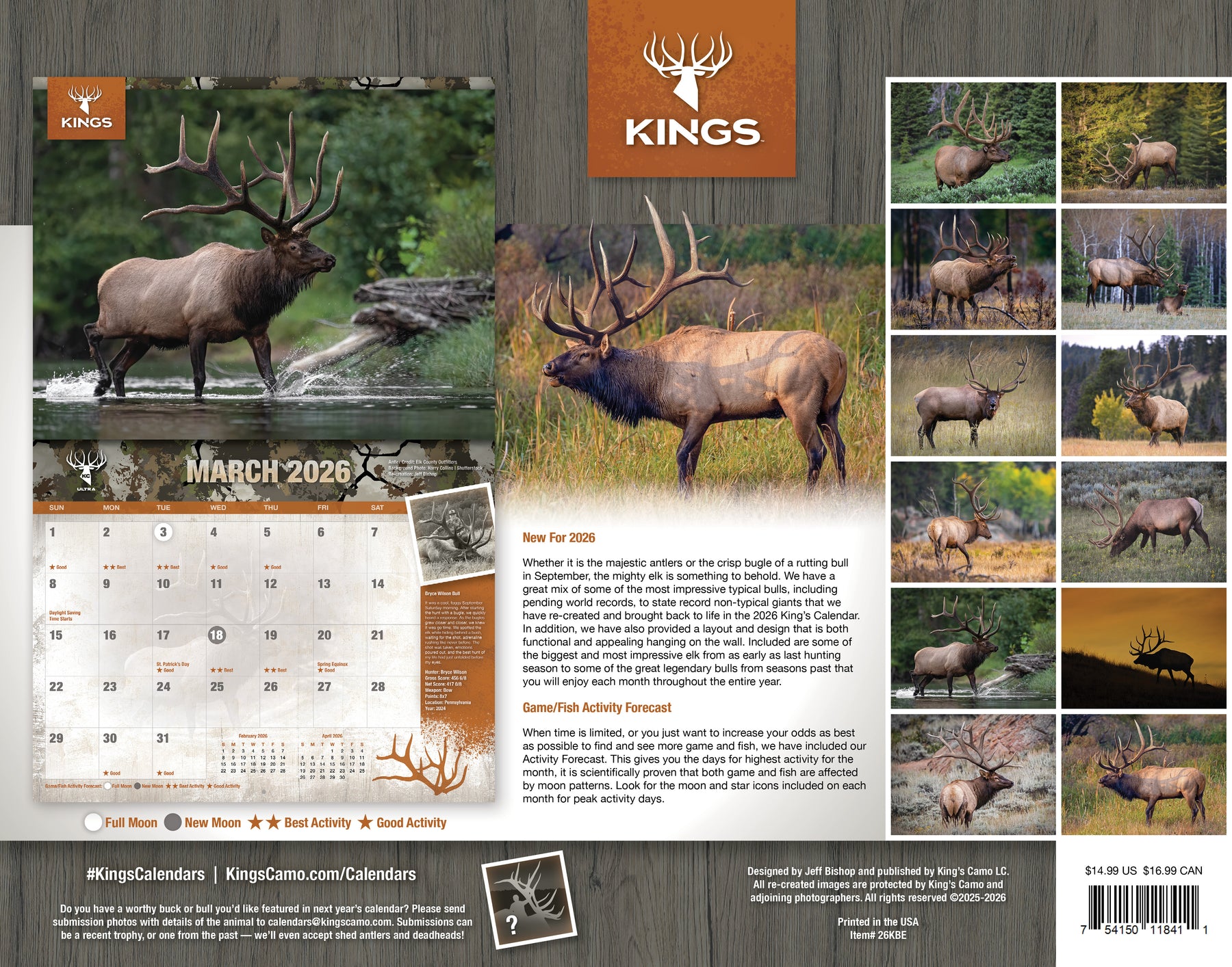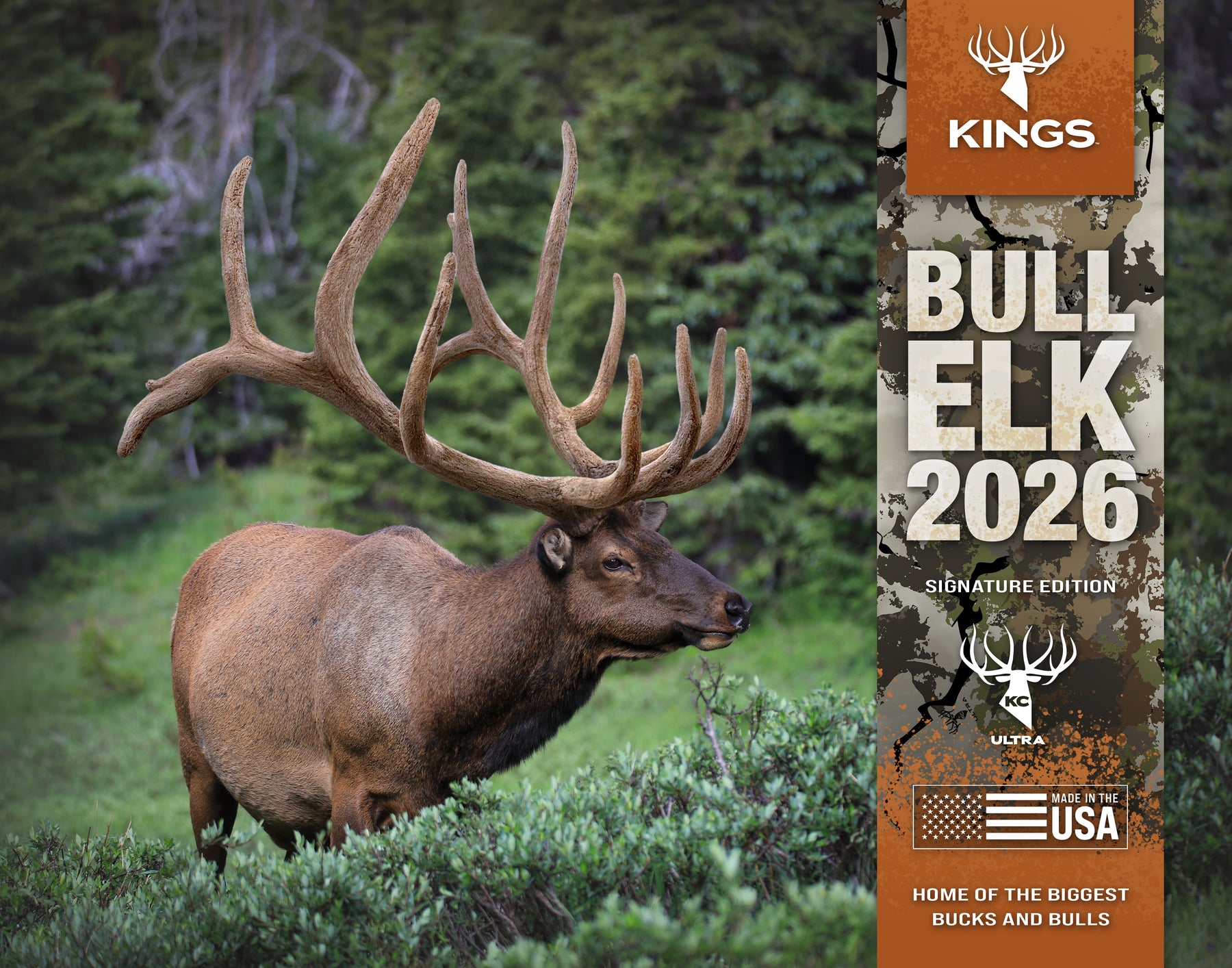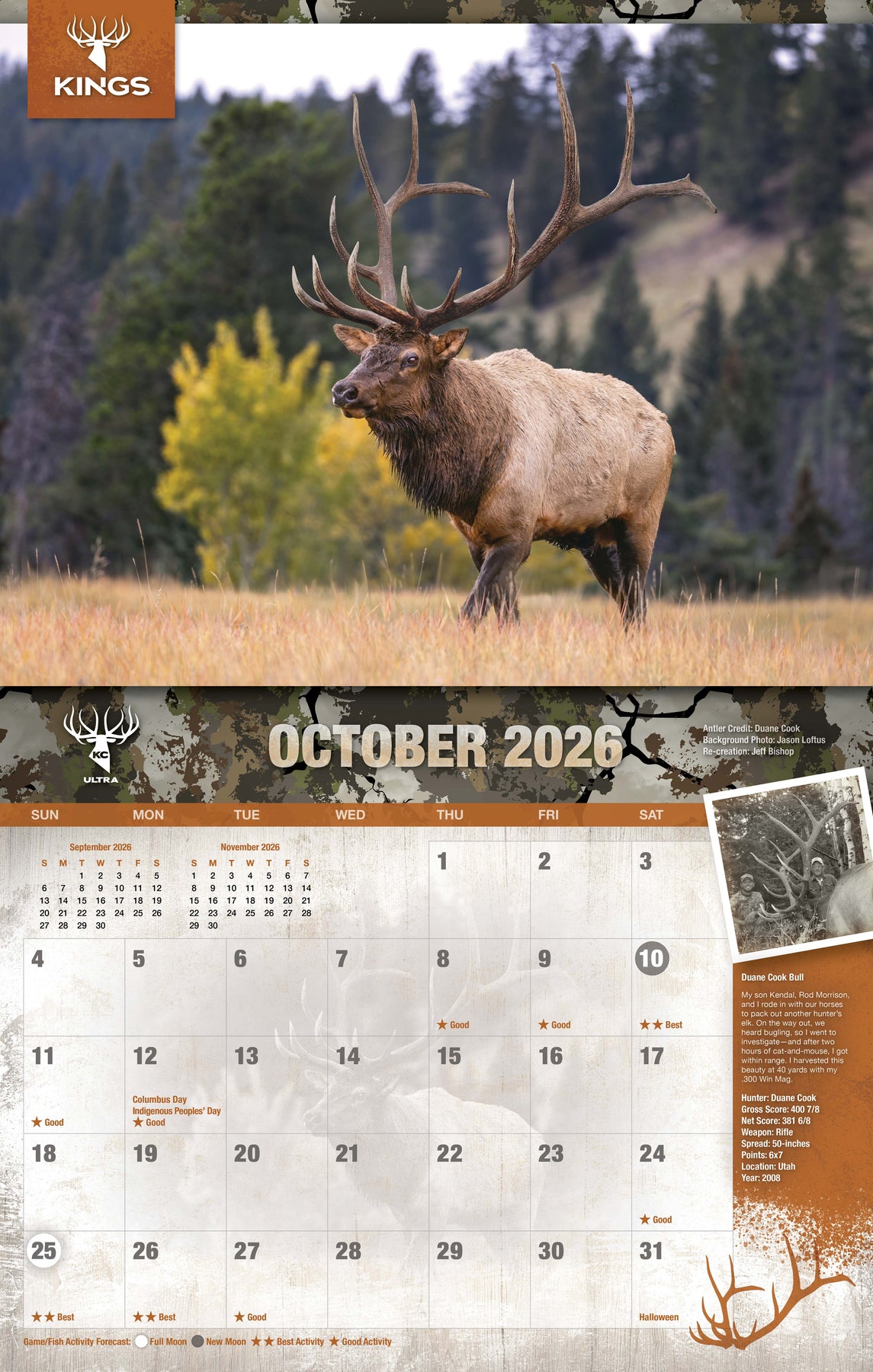 Whether it is the majestic antlers or the crisp bugle of a rutting bull in September, the mighty elk is something to behold. We have a great mix of some of the most impressive typical bulls, including pending world records, to state record non-typical giants that we have re-created and brought back to life in the 2026 Kings Calendar. In addition, we have also provided a layout and design that is functional and appealing hanging on the wall. Each page includes Kings Camo accented pages with King's newest pattern - KC Ultra. Included are some of the biggest and most impressive elk from as early as last hunting season to some of the great legendary bulls from seasons past for you to enjoy each month throughout the whole year.
