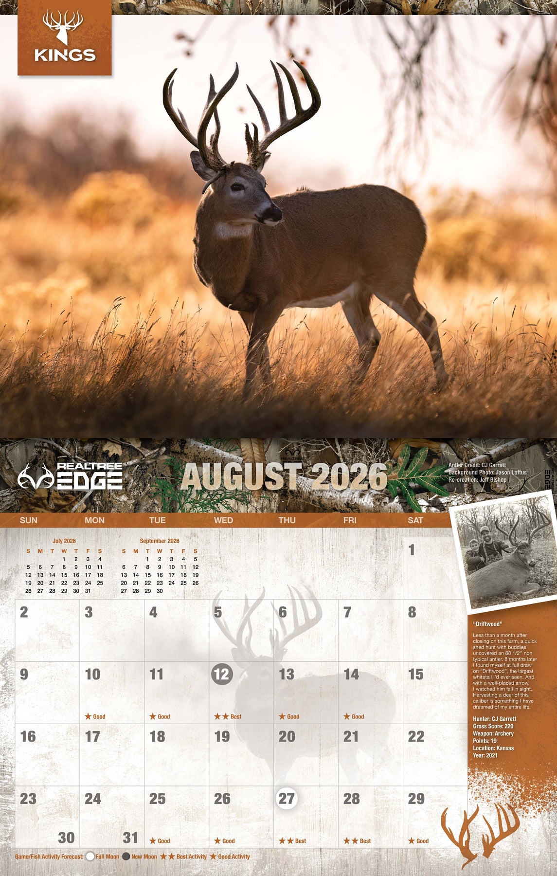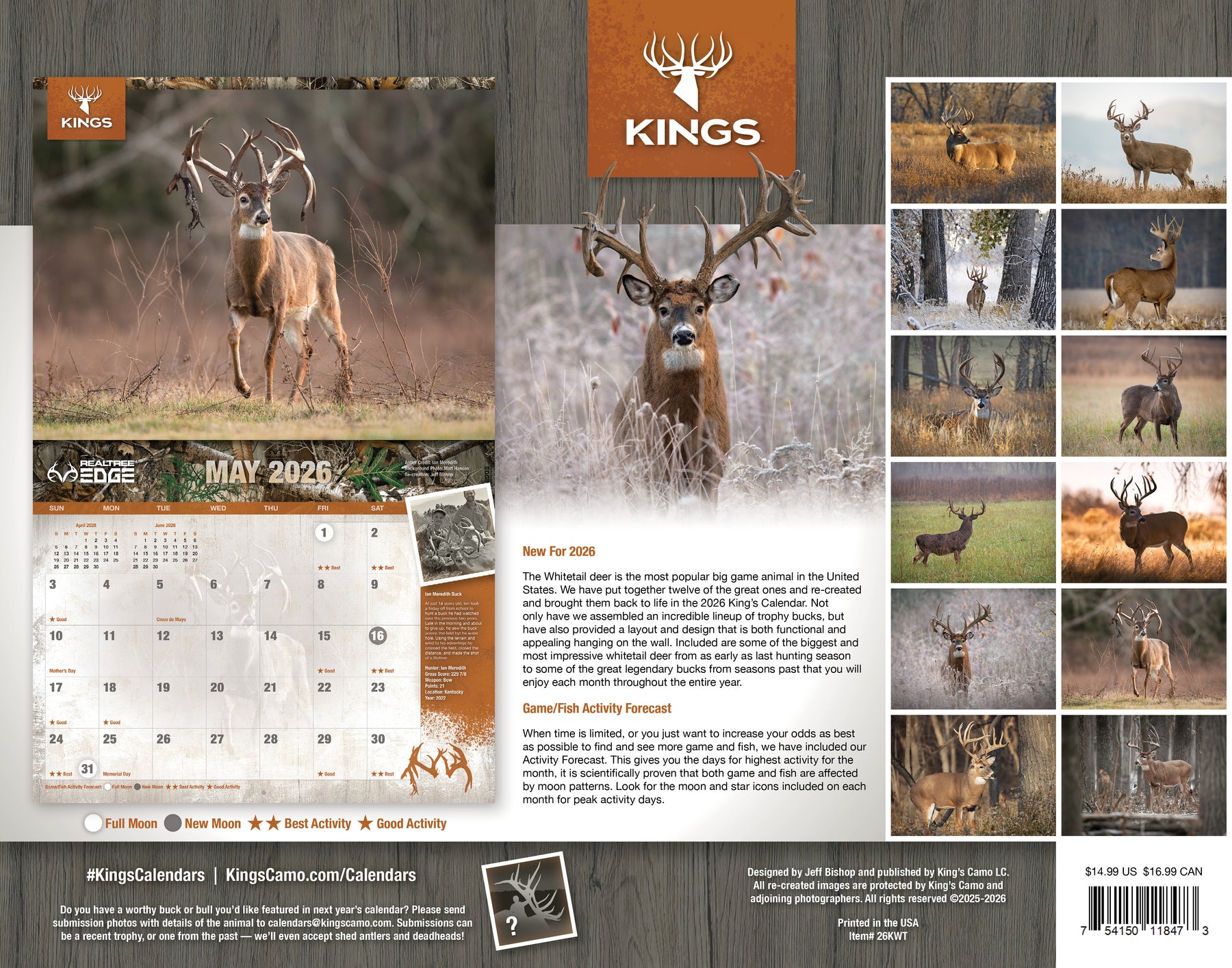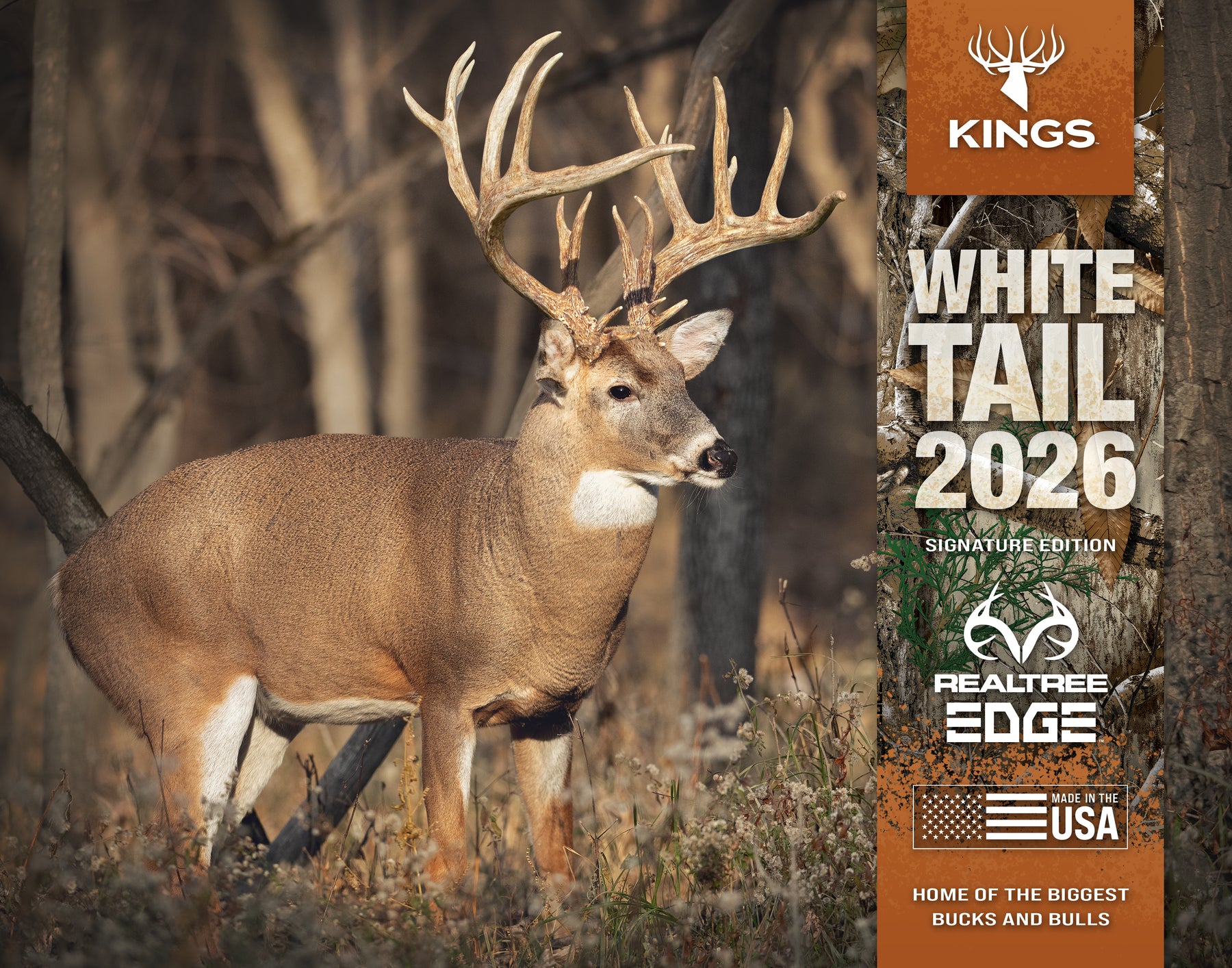 The whitetail deer is the most popular big game animal in the United States. We have put together twelve of the great ones and re-created and brought them back to life in the 2026 Kings Calendar. Not only have we assembled an incredible lineup of trophy bucks, but have also provided a layout and design that is functional and appealing hanging on the wall. Each page includes Kings Camo accented pages with Realtree EDGE. Included are some of the biggest and most impressive whitetail deer from as early as last hunting season to some of the great legendary bucks from seasons past for you to enjoy each month throughout the whole year.