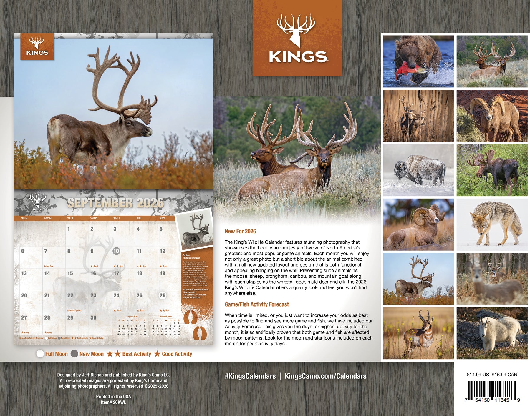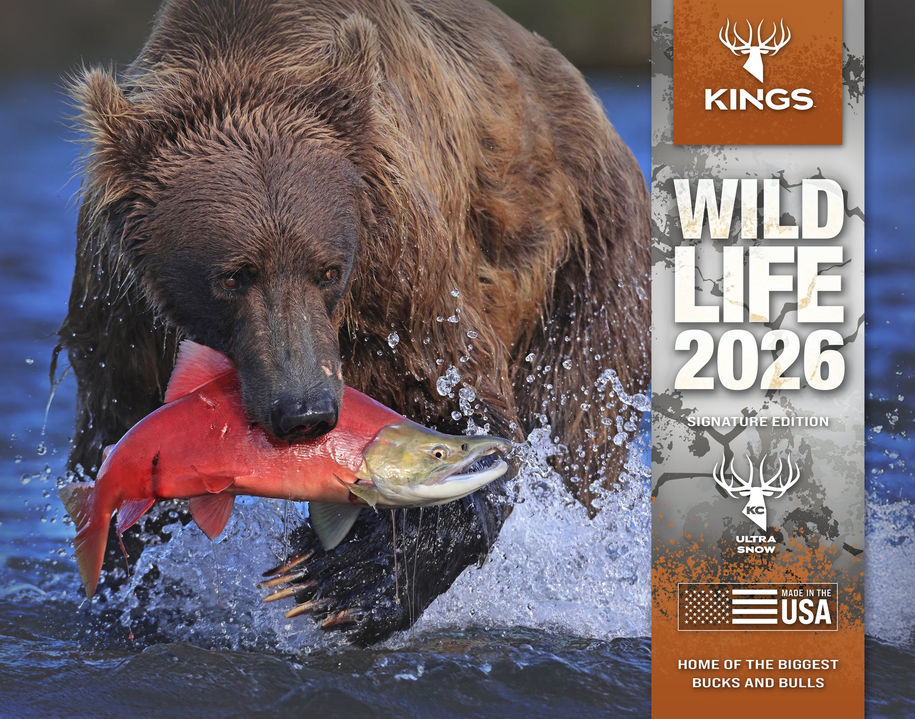 The Kings Wildlife Calendar features stunning photography that showcases the beauty and majesty of twelve of North America's greatest and most popular game animals. Each month you will enjoy not only a great photo but a short bio about the animal combined with an all new updated layout and design that is functional and appealing hanging on the wall. New for 2026 is the eye-catching new KC Ultra Snow pattern from Kings. Presenting such animals as the moose, sheep, pronghorn, caribou, and mountain goat along with such staples as the whitetail deer, mule deer and elk, the 2024 Kings Wildlife Calendar offers a quality look and feel you won't find anywhere else.