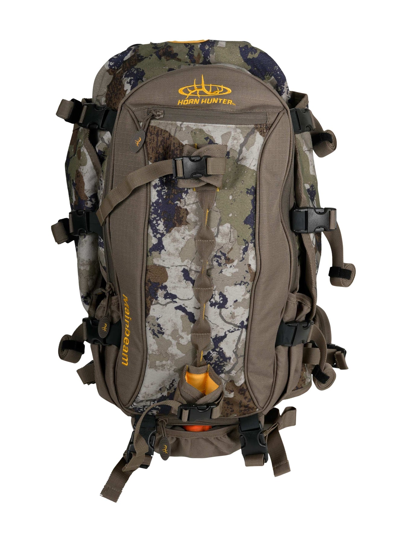 The Mainbeam Backpack is the most popular pack built by Horn Hunter. It excels as a day pack.The side wings allow for easy stowage for spotting scope and tripod and back gear grippers attach and secure your rifle or bow along with pull out pouch. The main compartment zips open and splits wide so you can pack out a deer front quarter with ease and securing it with buckle straps all the way across the pack.
