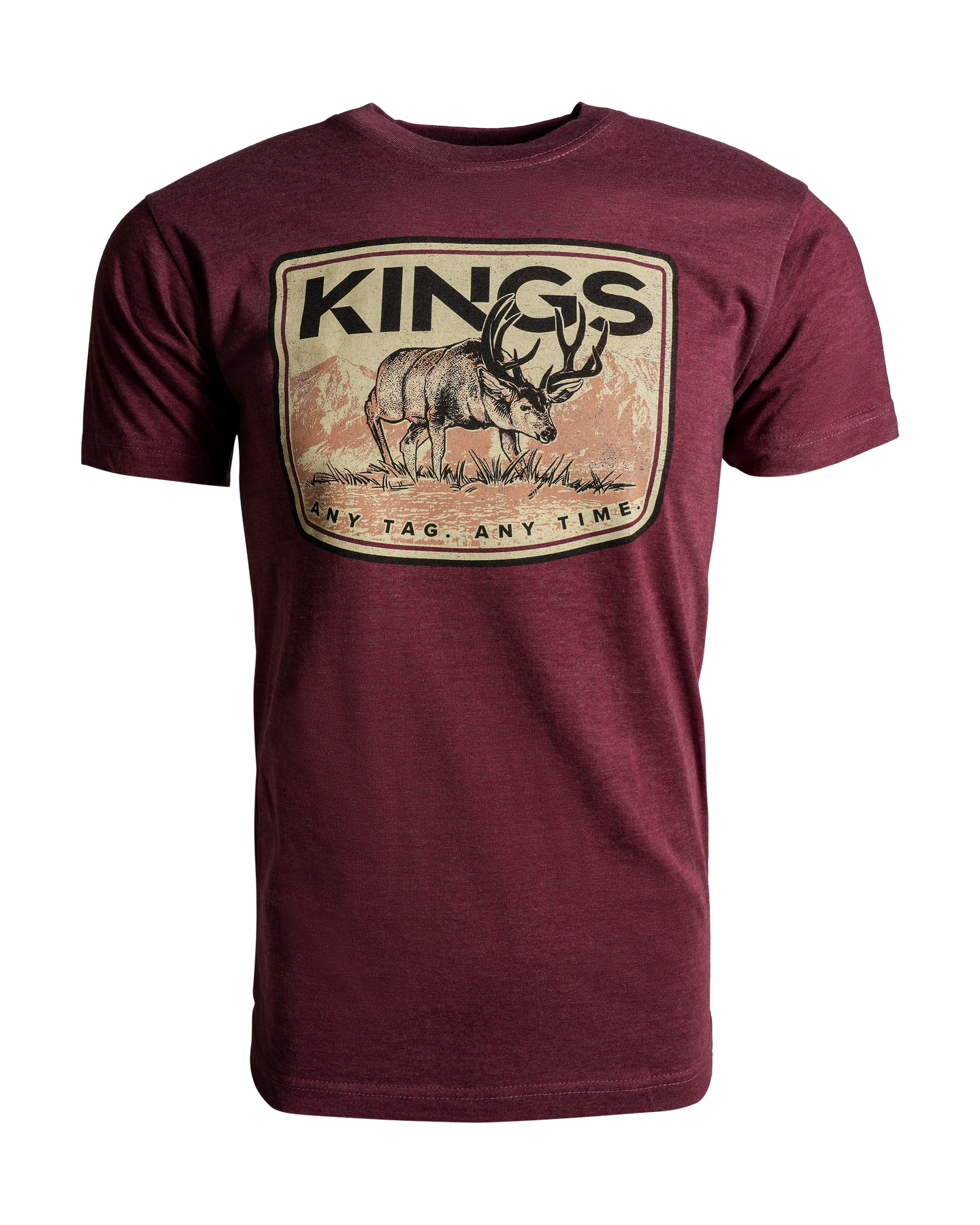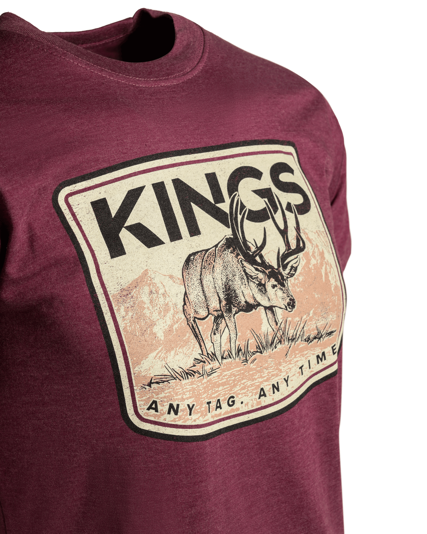 Screen printed Kings logo with beautiful hand drawn trophy mule deer artwork design.