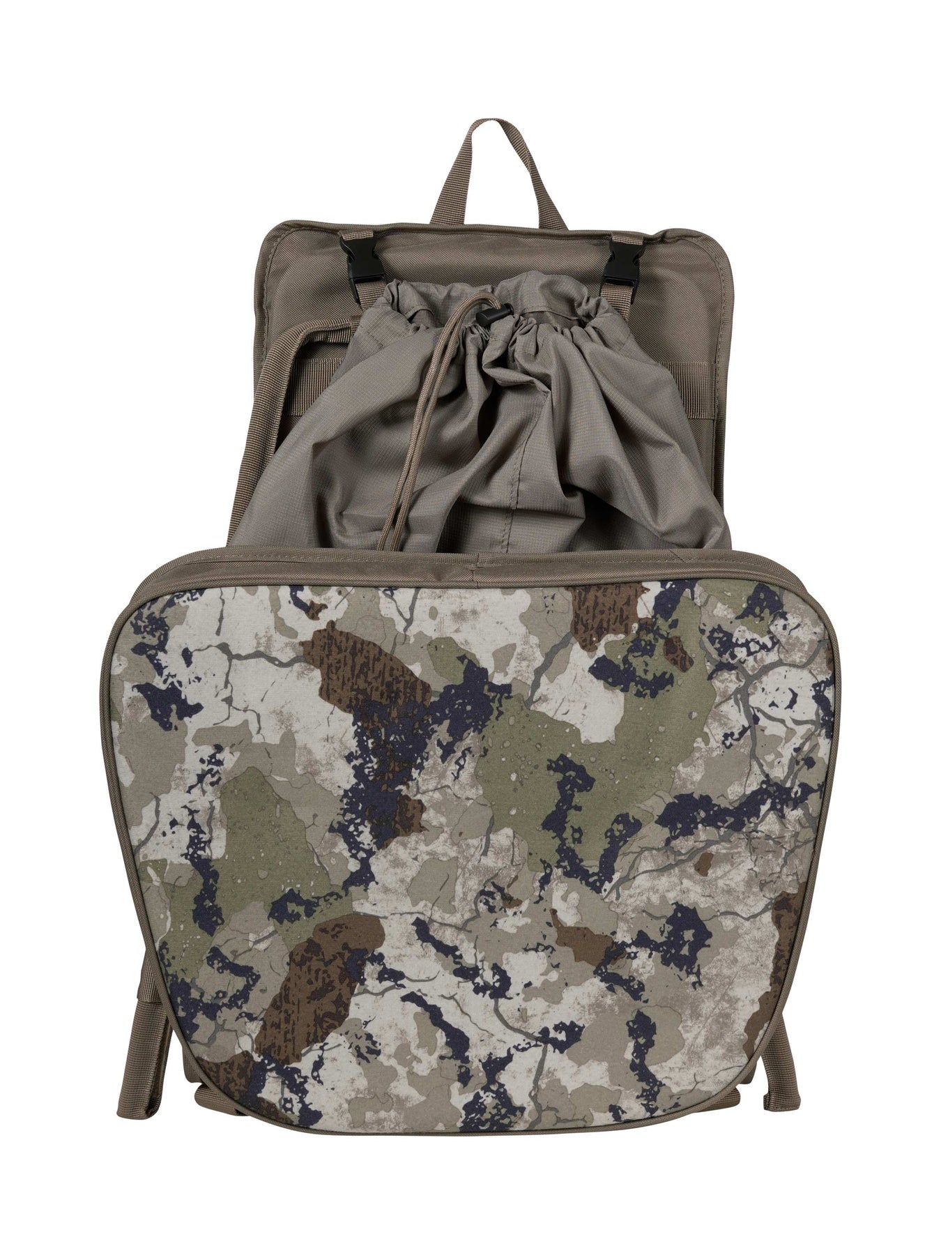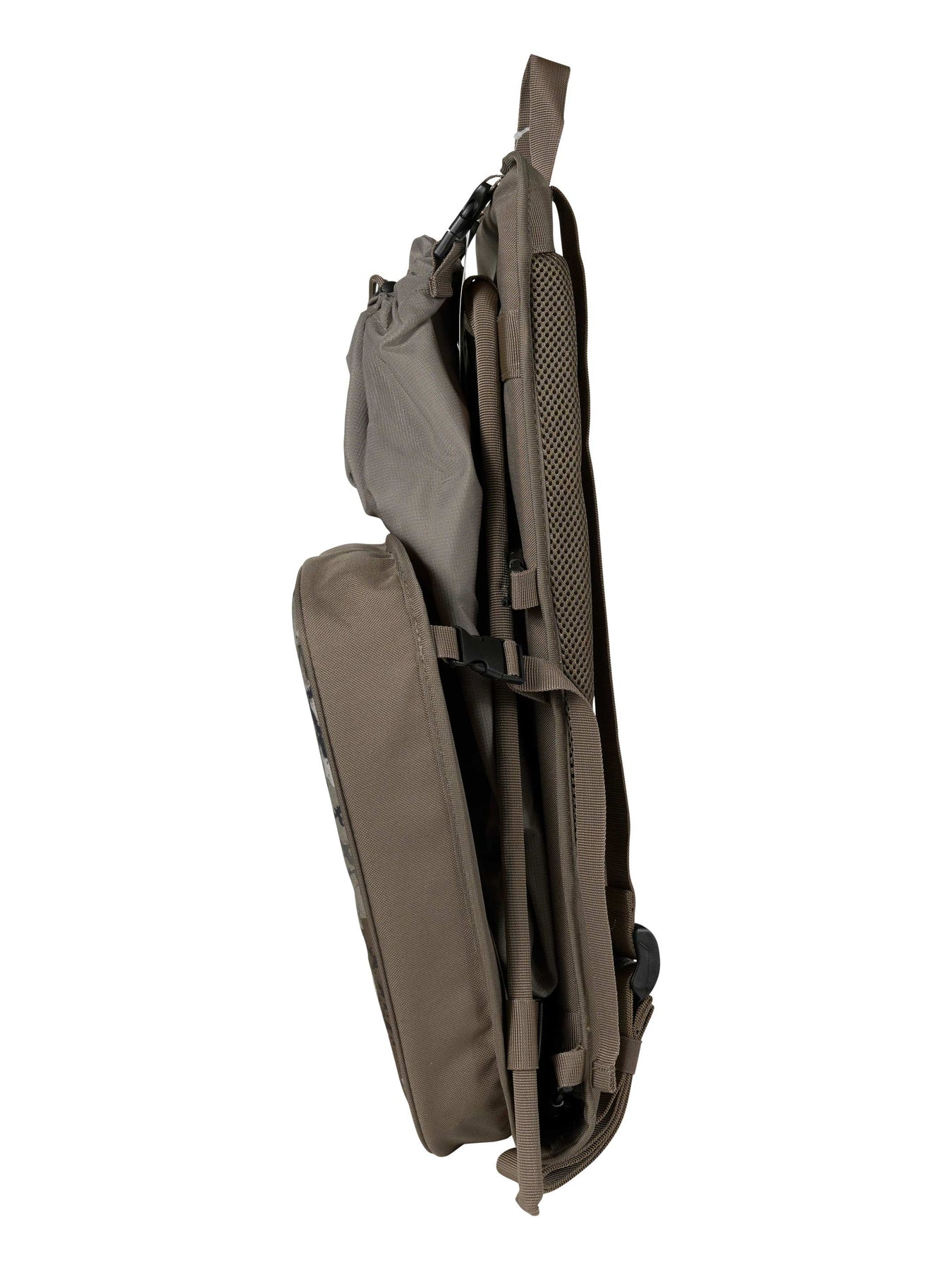 The frame provides a stable back rest. It can be adjusted to compensate for various terrain and positions. The detachable drawstring string bag is great for decoys or electronic calls. It all folds up into a convenient hands, free pack.